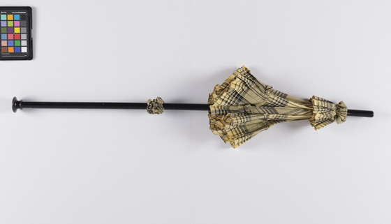 Playsuit: Cotton plain weave. Parasol: Cotton plain weave, wood.