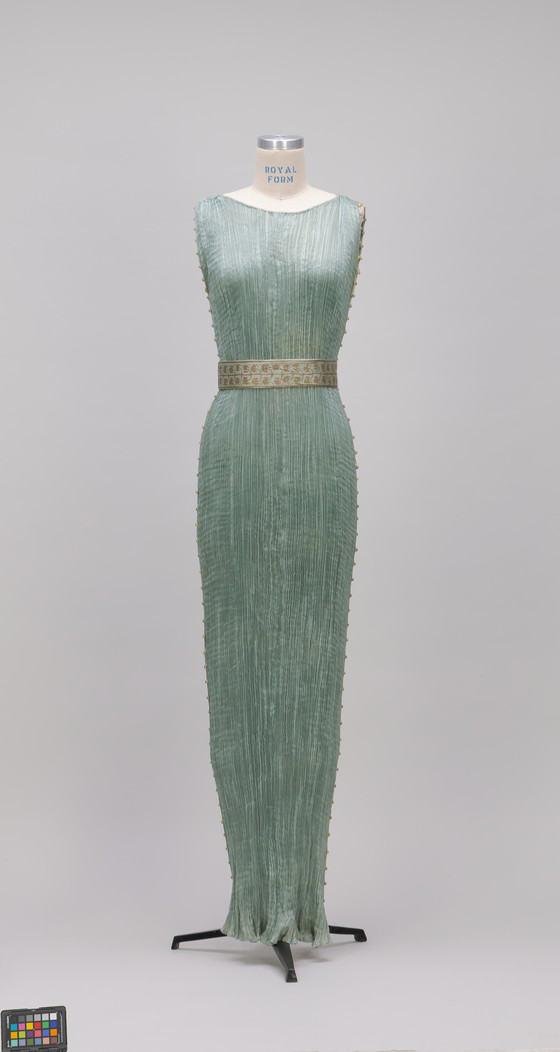 a) Dress: Silk plain weave, pleated, with silk cord and murano glass beads; b) Belt: Silk satin, hand-stencil printed