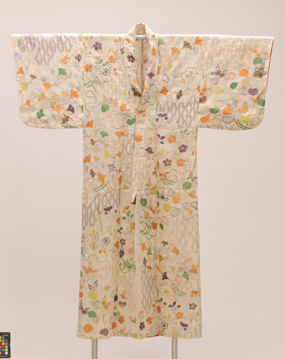 Samurai-class Woman's Summer Kimono (katabira) with Cherry Blossoms, Ginkgo Leaves, Lantern Plant (hōzuki), and Net Pattern