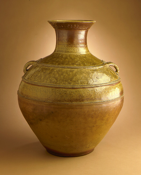 Proto-Yue ware, wheel-thrown stoneware with applied and incised decoration and green glaze