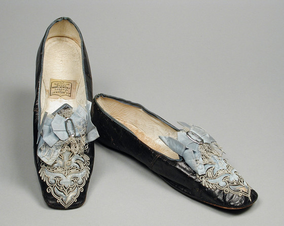 Leather with silk satin, silk embroidery, silk lace, and metal buckles