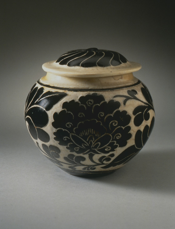 Cizhou ware type, wheel-thrown stoneware with cream glaze and wax-resist and carved black overglaze decoration