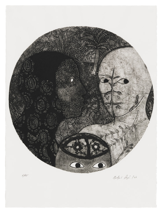 An exceptional printmaker, Belkis Ayón is part of a generation of Cuban artists active during the “Special Period”–a prolonged phase of economic crisis in Cuba that began roughly in 1991 and coincided with the fall of the Soviet Union and the collapse of socialism in eastern Europe. Her brilliant career was cut short in 1999, when at the age of thirty-two she unexpectedly committed suicide. From 1986 to 1991, Ayón studied printmaking at the reputed San Alejandro Academy in Havana. While several artists from the island had been interested in the Afro-Cuban spiritual practices of the Congo and Yoruba, Ayón delved deeply into the myths of the Abakuá religion, devoting most of her collagraphs—her preferred printing technique—to the topic. The images, many monumental in scale, are tinged with a profound sense of mystery and dislocation. On the surface, they give visual form to a Nigerian myth in which the princess Sikán was ruthlessly sacrificed for revealing an important secret. In Ayón’s prints, Sikán often becomes a surrogate for the artist. In many of the prints, the black figures are associated with living beings and earthly darkness, while the white ones are connected with death and liberated souls. The meaning of the white figure in this image, peering out intently at the viewer, remains enigmatic and may simultaneously represent Sikán and Ayón.