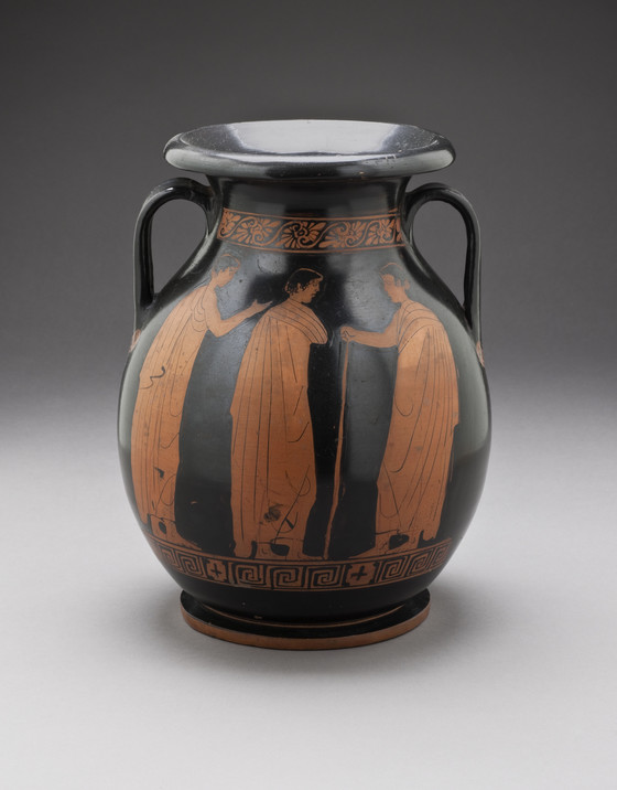 Attic Red-Figure Pelike with (A) Dionysos between a Satyr Playing the Pipes and a Maenad and (B) Three Youths