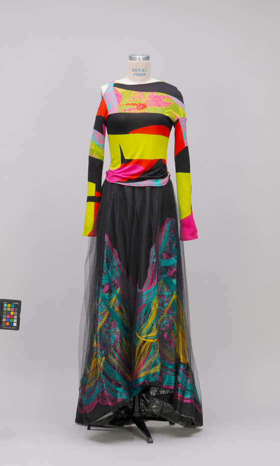 Blouse: silk knit; Skirt: silk plain weave with silk supplementary-weft patterning, silk net, and plastic
