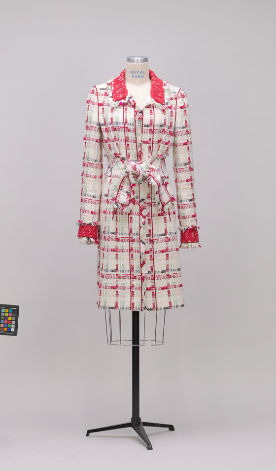 Coat: wool twill with wool supplementary warp and weft patterning and wool crochet; Handbag: wool twill with wool supplementary warp and weft patterning, metal, and leather