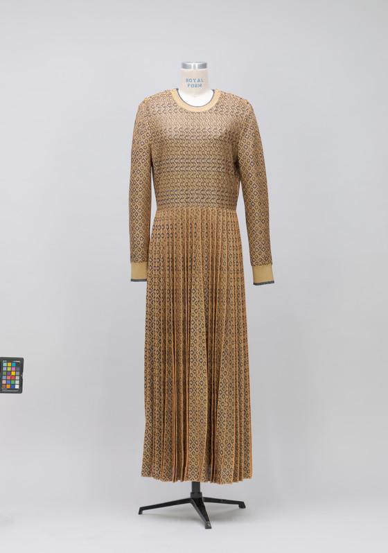 Dress: Viscose and Lurex (polyeter-metallic thread) knit with metal buttons; Slip: Silk plain weave (crepe)