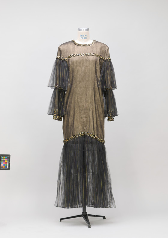 Silk and Lurex (polyester-metallic thread) plain weave (crepe), silk and Lurex (polyester-metallic thread) knit, with plastic beads and sequins