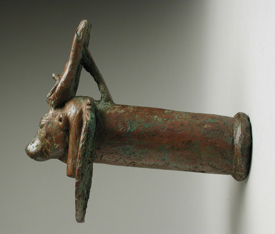 Height of cow's head and aegis: 4 in. (10.16 cm); Width of head and aegis: 2 11/16 in. (6.8 cm); Length of staff holder: 4 1/2 in. (11.5 cm)