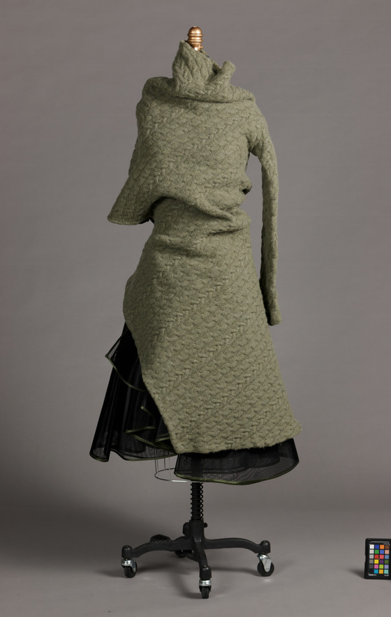 Dress: wool knit (cable knit); Skirt: nylon plain weave, silk satin ribbon
