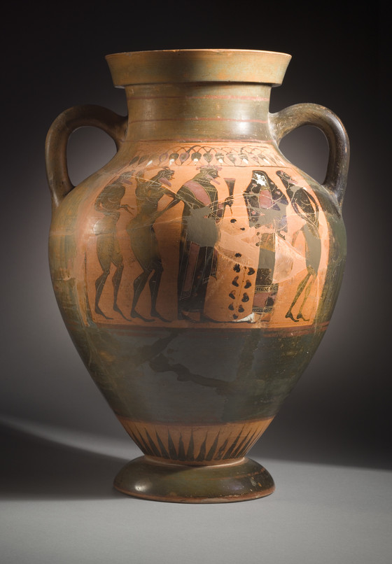 Amphora with Herakles Fighting Geryon and Eurytion and Dionysos Accompanied by Three Satyrs and a Woman
