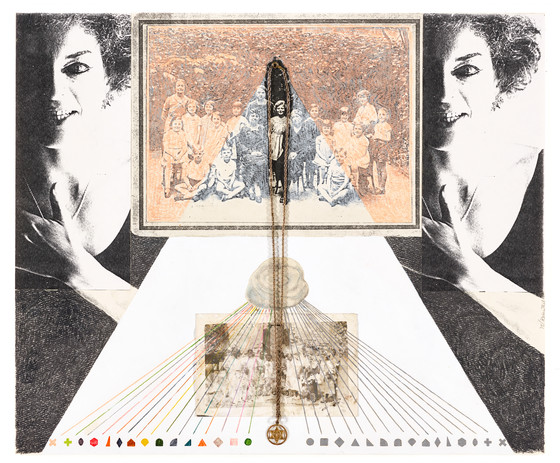 Collage of photocopies and gelatin silver print with graphite, colored pencil, and gold-plated metal chain with pendant on paper