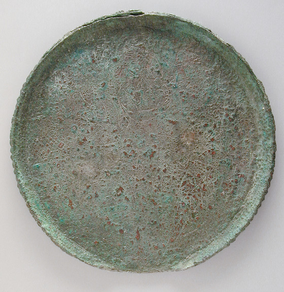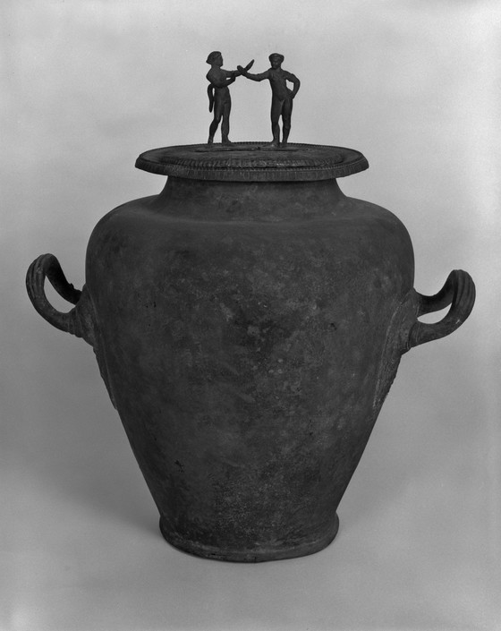 Stamnos and Lid (Mirror) with a Handle in the Form of a Satyr and a Maenad