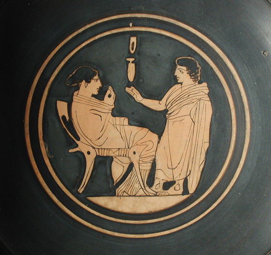 Red-Figure Stemless Cup with a Seated Woman and a Youth