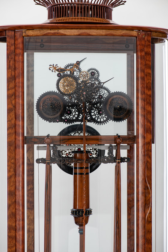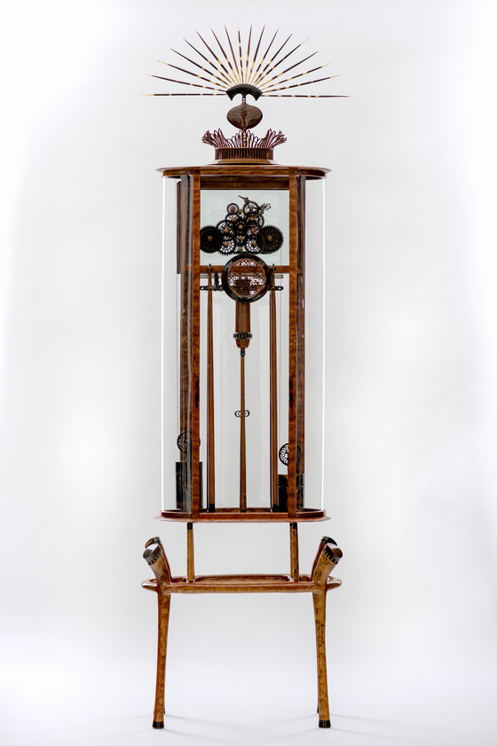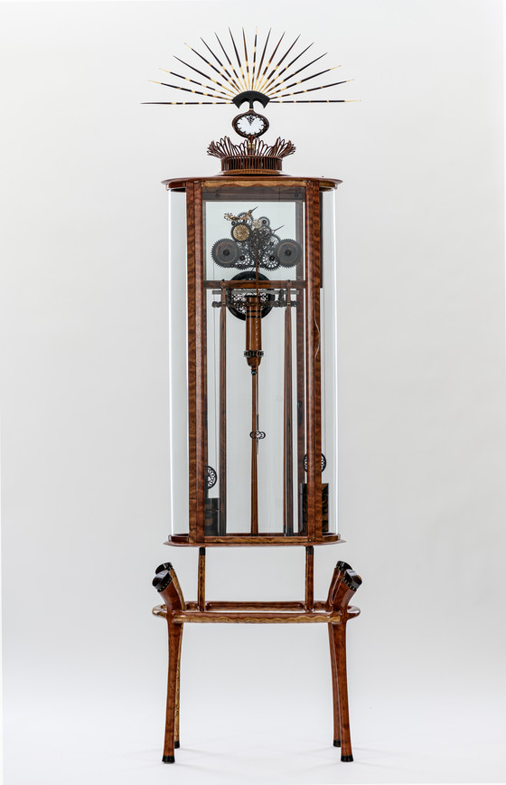 Curly and spalted bubinga, walnut, rosewood, ebony, African Blackwood, oak root, 18k gold, glass, garnets, tourmalines, sapphire, topaz, rubies, diamonds, curved and etched mirror, porcupine quills, black pearls, ivory