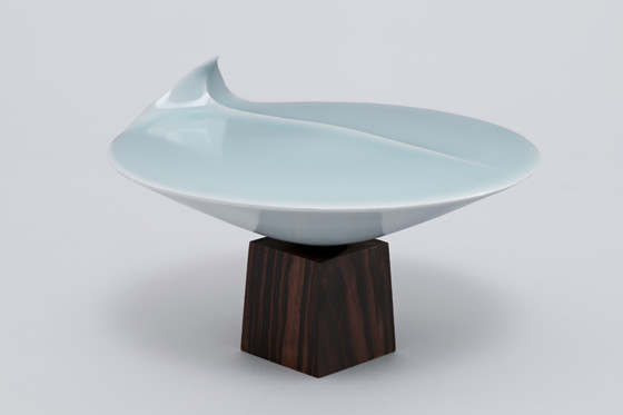 Porcelain with light blue celadon glaze (seihakuji) with ebony wood foot