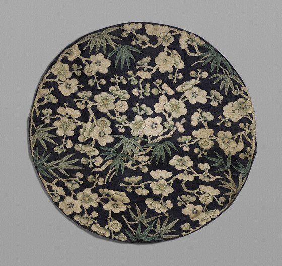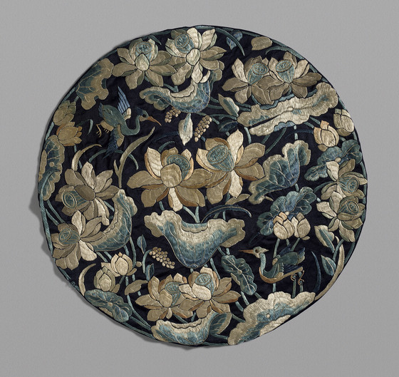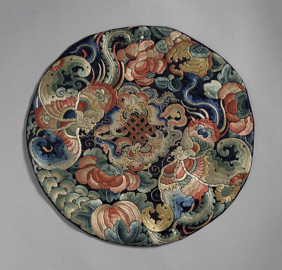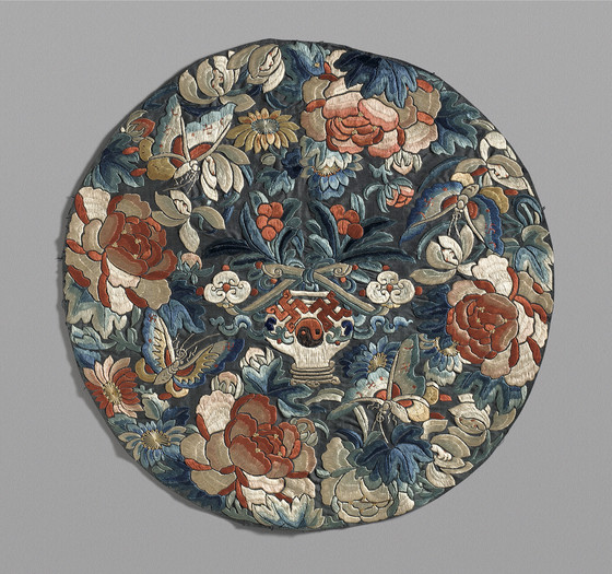 a) Silk embroidery on silk satin in Peking knot and satin stitch; b) Silk tapestry (kesi) with painted details; c) Silk embroidery on silk satin; d) Silk embroidery on silk damask