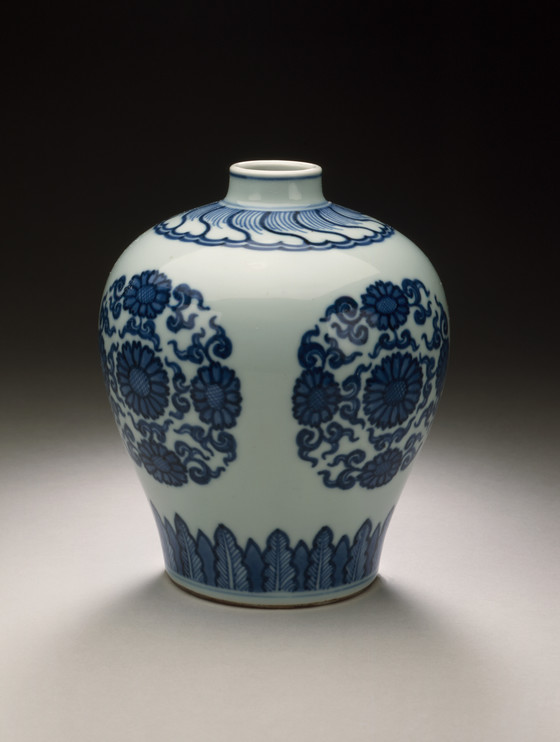Wheel-thrown porcelain with blue painted decoration under clear glaze