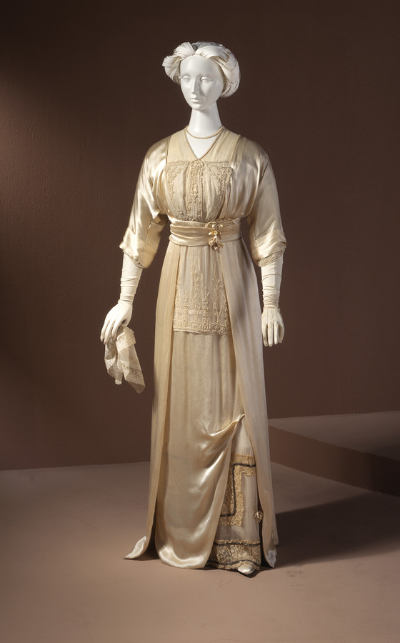 Train: Silk satin, silk lace, silk plain weave (crepe chiffon), glass beads, and faux pearls
