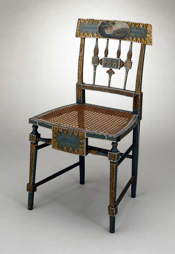 Walnut, hickory, cane, paint, gilt