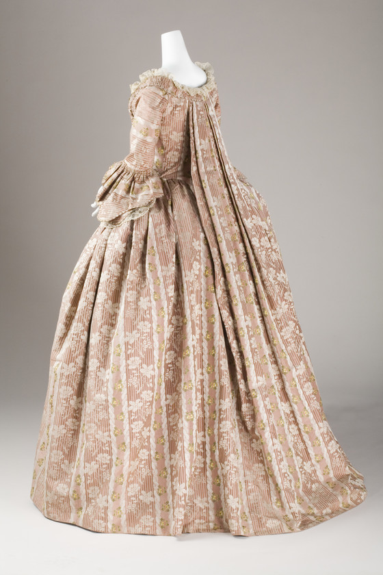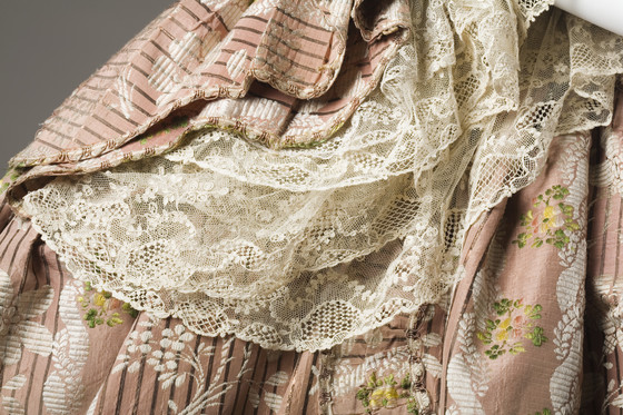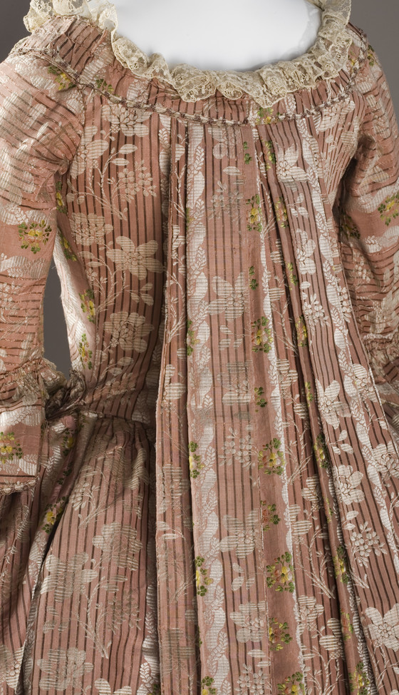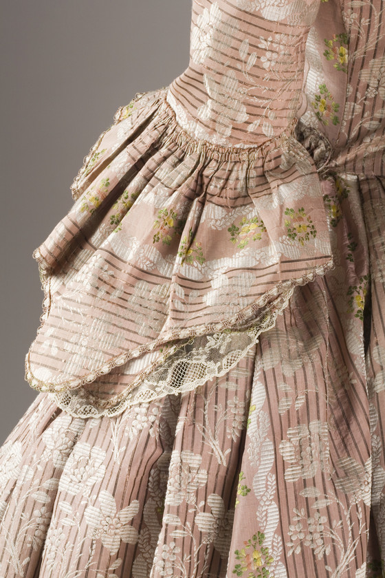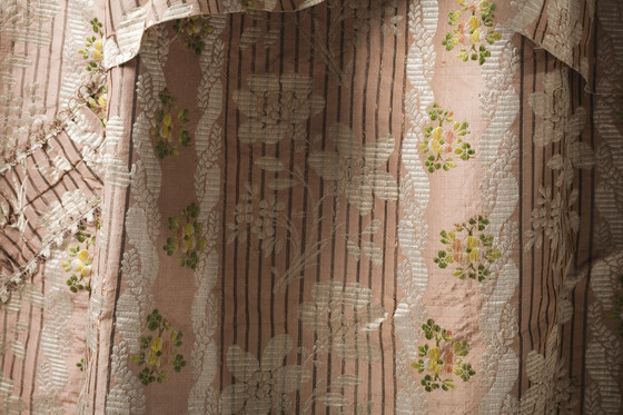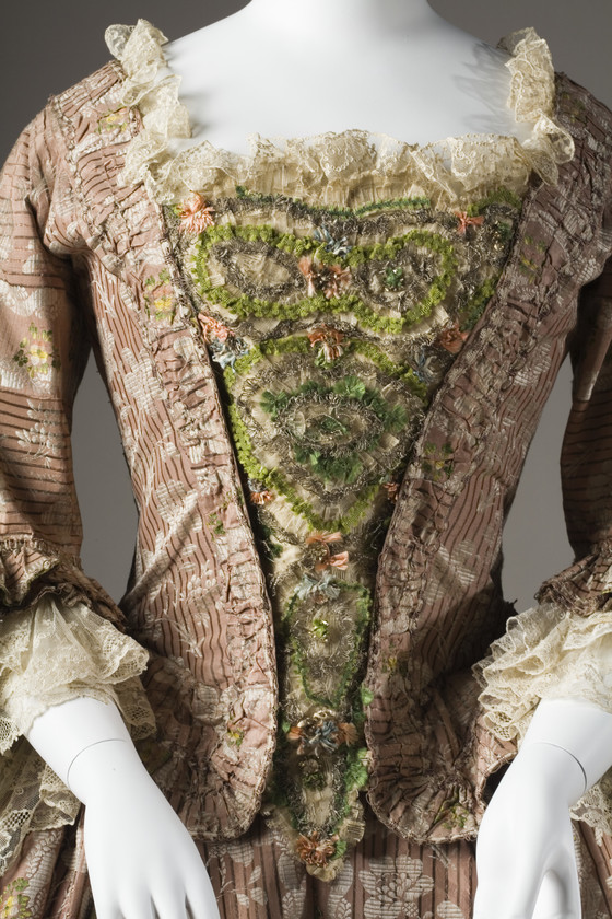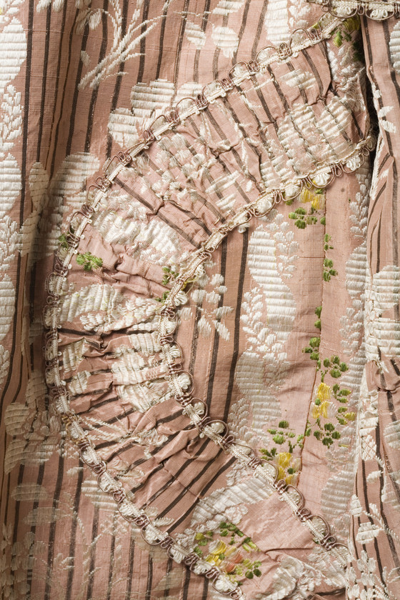Silk plain weave (taffeta) with silk supplementary-weft patterning and silk passementerie trim