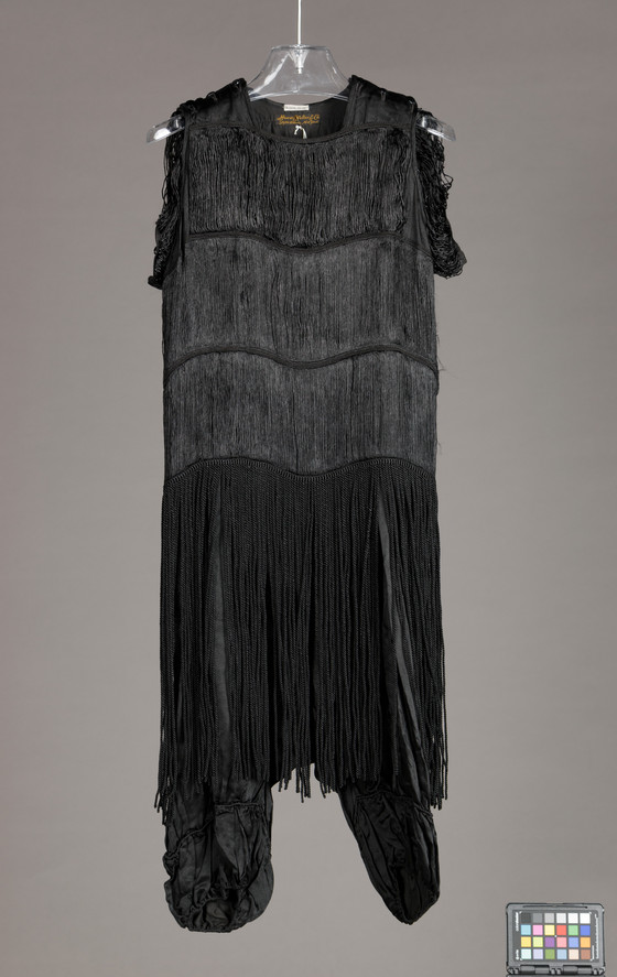 Silk satin, with silk fringe trim and plastic buttons