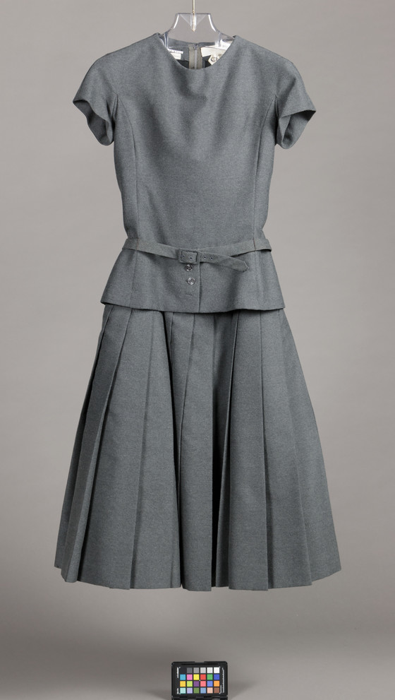 Coat and Overbodice: Wool plain weave, fulled, plastic buttons. Dress: Wool plain weave, fulled.