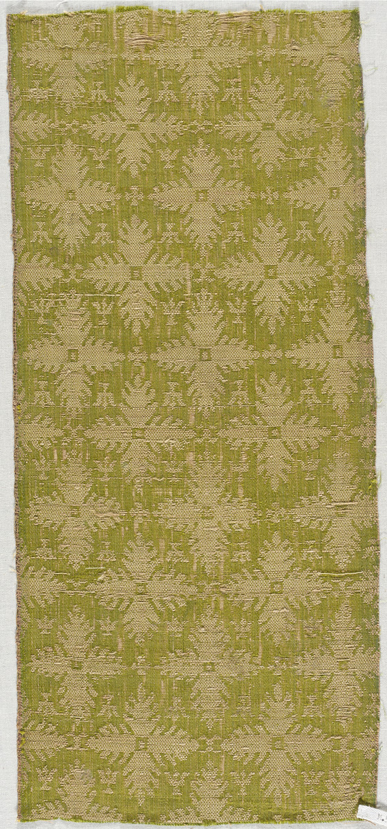 Silk satin with linen supplementary weft patterning bound in twill (brocatelle)
