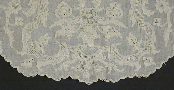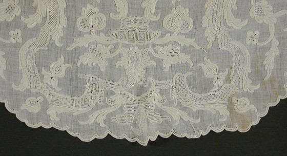 Linen plain weave with cotton embroidery (drawn-work, shadow and feather stitch)