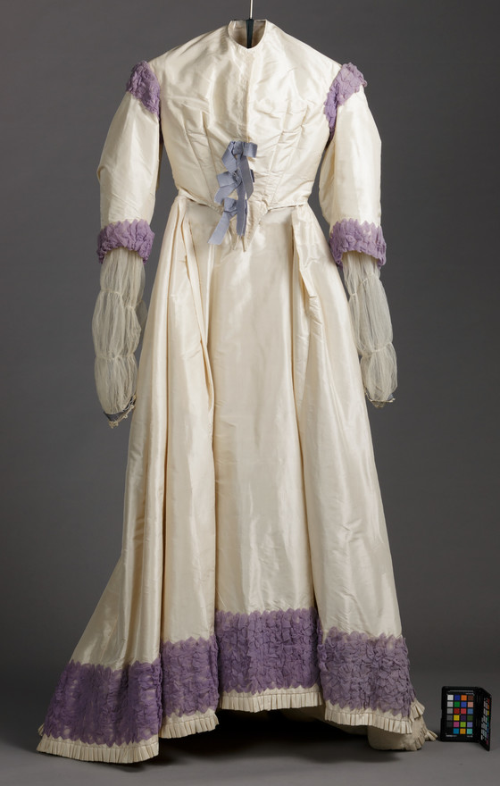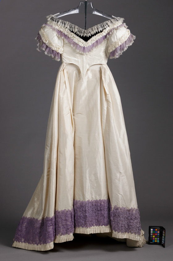 Evening Bodice: Silk plain weave (taffeta), with silk velvet, silk plain weave (crepe), silk tulle, and silk lace trim. Day Bodice: Silk plain weave (taffeta), with silk ribbon, silk plain weave (crepe), silk tulle, and linen lace trim. Skirt: Silk plain weave (taffeta) with silk plain weave (crepe) trim.