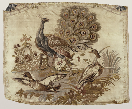 Silk satin with silk and silk-chenille discontinuous supplementary weft patterning (brocade)