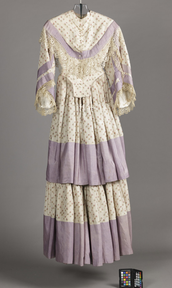 Bodice: silk plain weave, warp printed (chine taffeta) and silk plain weave (taffeta), with linen lace, silk cord, and glass buttons; Skirt: silk plain weave, warp printed (chine taffeta) and silk plain weave (taffeta); Sleeves: cotton plain weave (organdy) with cotton embroidery and cotton lace