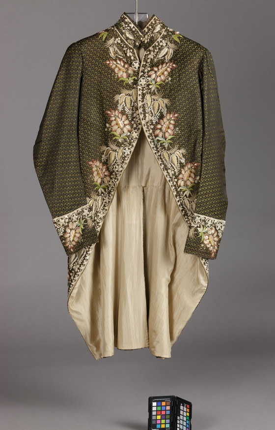 Silk plain weave (gros de tours) with weft patterning and silk embroidery