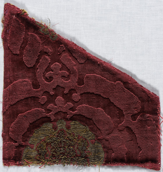 Silk cut and voided pile-on-pile velvet with metallic-thread supplementary weft-loop (bouclé) and discontinuous supplementary-weft patterning (brocade)