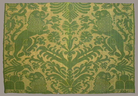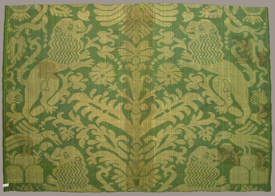 Silk plain weave with metallic-thread supplementary-weft patterning bound in plain weave (lampas)