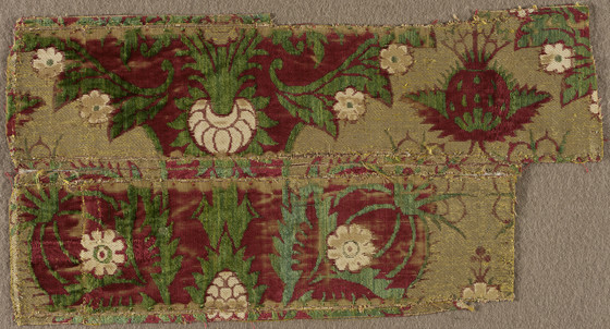 Silk cut and voided velvet with silk and metallic-thread discontinuous supplementary-weft patterning (brocade)