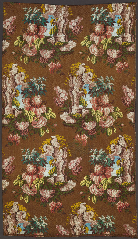 Silk plain weave with warp-patterning and silk discontinuous supplementary-weft patterning (brocade)