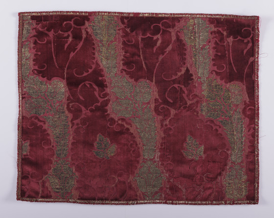 Silk cut and voided velvet with metallic-thread discontinuous supplementary-weft patterning (brocade) with silk and metallic-thread passementerie