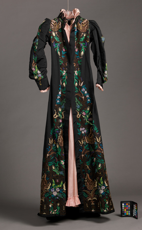 Silk plain weave (faille) with silk embroidery, and silk plain weave with jet beads