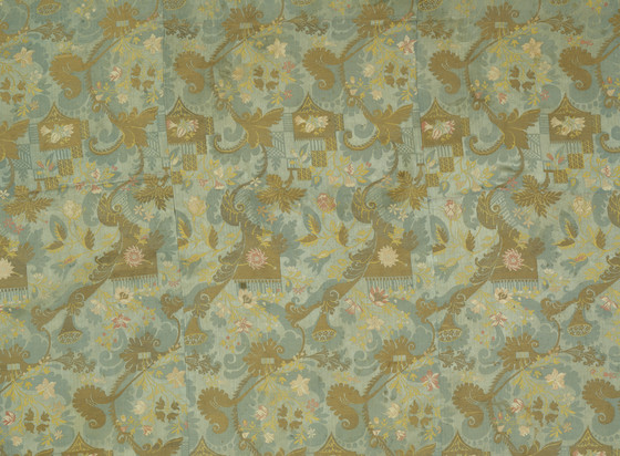 Silk damask with silk and metallic-thread discontinous supplementary-weft patterning (brocade) with silk and metallic-thread passementerie