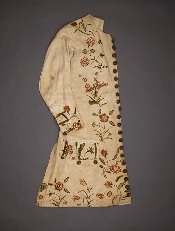 Linen plain weave with silk and metallic-thread embroidery, and metallic-thread covered buttons