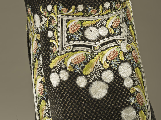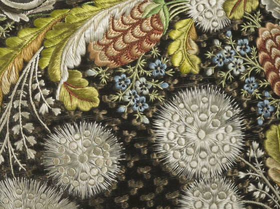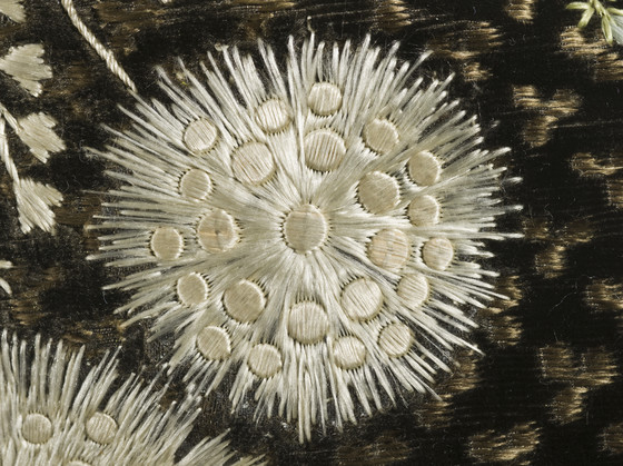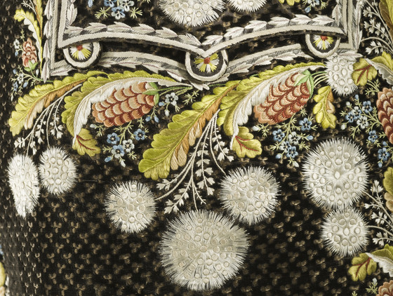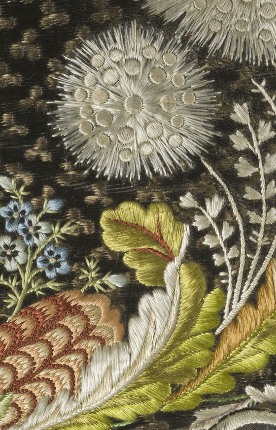 Silk cut and voided velvet on plain weave foundation with supplementary weft float patterning and silk embroidery