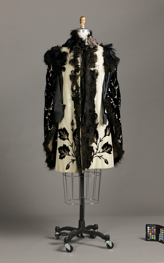 Wool plain weave (broadcloth), silk cut, uncut, and voided velvet on silk satin ground, feathers, silk satin ribbon, silk flowers