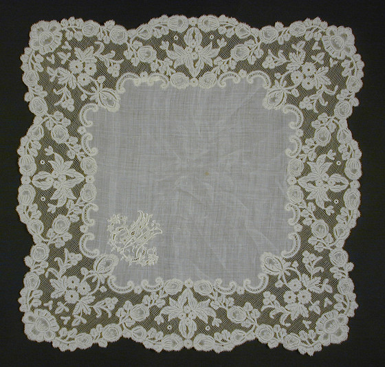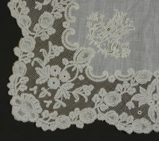 Linen plain weave with cotton embroidery and cotton bobbin lace (Valenciennes de gand)