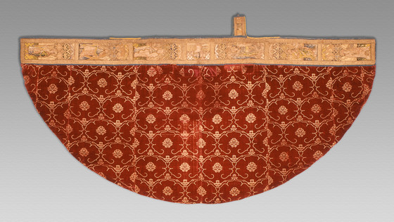 Voided silk velvet; orphrey embroidered with colored silk and metallic threads