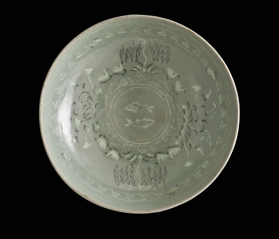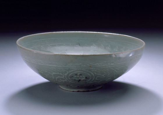 Wheel-thrown stoneware with incised and slip-filled decoration and green glaze