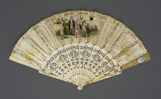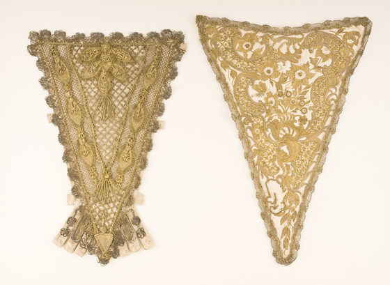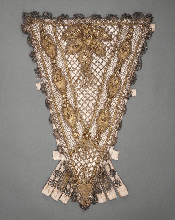 Silk satin with metallic-thread lace, silk and metallic-thread plain-weave appliqués, metallic-thread passementerie, and tassels
