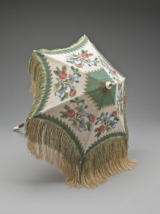Silk knit with glass and steel beads, silk fringe, wood, bone, and metal