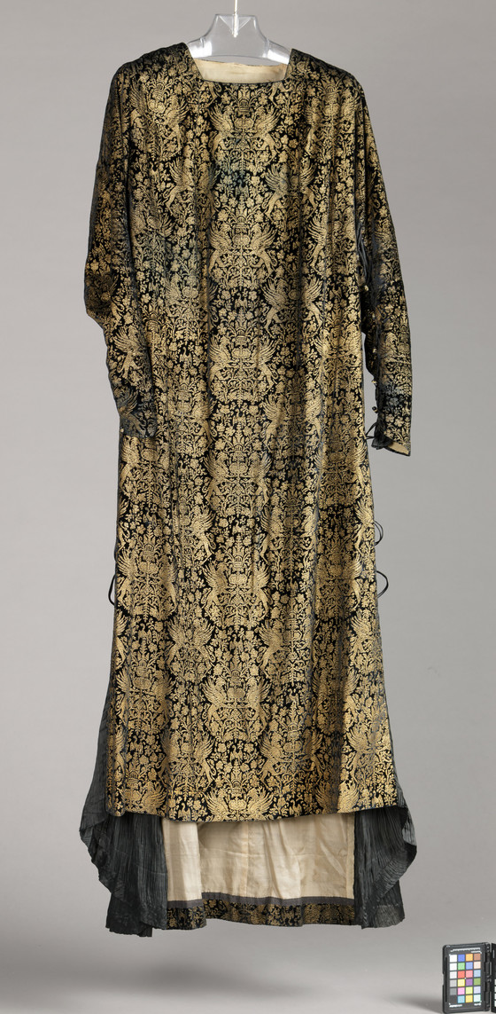 Silk velvet, printed and embossed and silk twill, pleated, with silk cord and glass beads