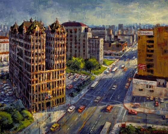 Abril has always been interested in historic buildings and has often depicted them as contrasting with the newer structures in his native city. This painting was completed after he had finished a series of thirty-six paintings of the old buildings in the Bunker Hill area of downtown, 1959-63 (LACMNH). The Old Hall of Records was demolished in 1973 in the course of an urban renewal project. Designed by the firm of Hudson and Munsel, the building was erected in 1909 on Pound Cake Hill at Temple and Broadway streets. It remained in use until after the new Hall of Records was built across the street. In 1966, as part of his preparation for this painting, Abril photographed and drew sketches of the old building from the fifteenth floor of the recently completed Hall of Records. Such a close, yet high vantage point enabled him to delineate the massive, turreted old hall in all its dignity. Abril painted the canvas in his characteristically bright, contemporary version of the impressionist style.